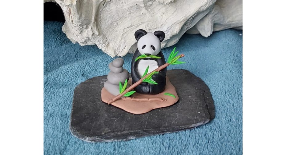 Un panda gourmand dans sa forêt de bambous, sur son socle en ardoise. Un symbole d’une nature à protéger et respecter.